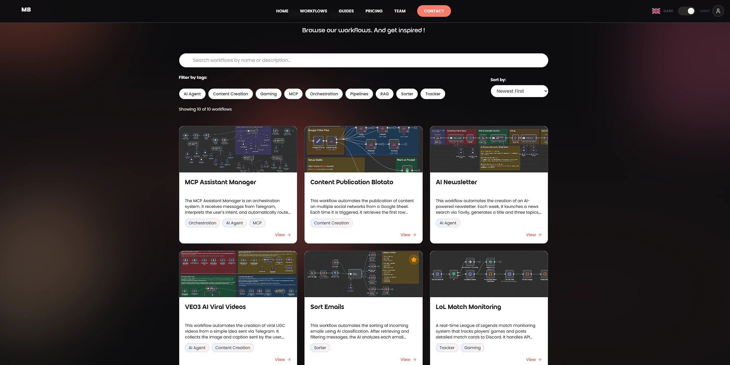 Design and development of a web platform to browse, preview, and download n8n automations. Each workflow covers a real use case: AI-powered email sorting, newsletter generation, RAG pipelines, multi-platform content publishing, ...